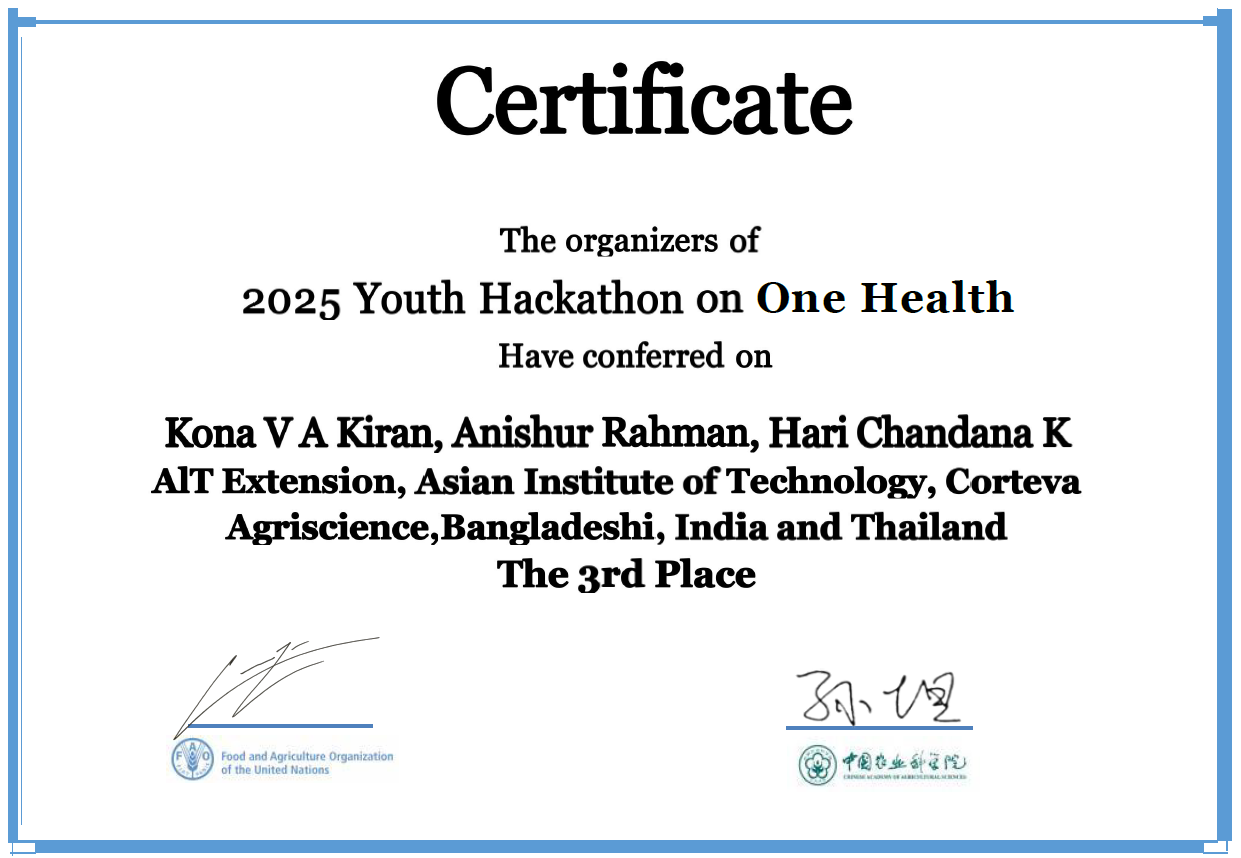 Team AgroSentinel, a multidisciplinary team led by members of AIT Extension, Asian Institute of Technology (AIT), Thailand, has been awarded Third Prize in the New Service Track at the 4th FAO–CAAS Youth Hackathon on One Health, jointly organized by the Food and Agriculture Organization of the United Nations (FAO) Representation in China and the Chinese Academy of Agricultural Sciences (CAAS).