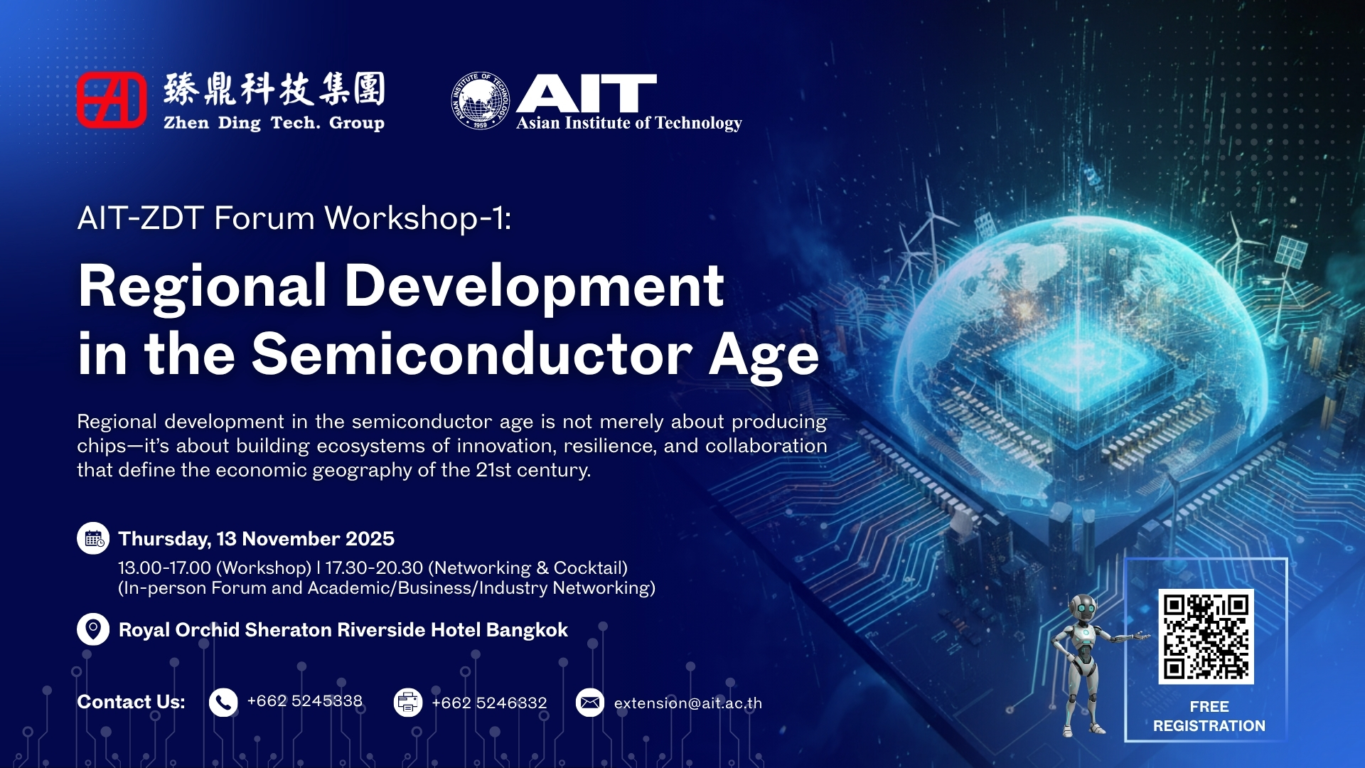 The Asian Institute of Technology (AIT), in collaboration with Zhen Ding Technology Holding Limited (ZDT), of Taiwan, will host the first AIT–ZDT Forum Workshop under the theme “Regional Development in the Semiconductor Age.”