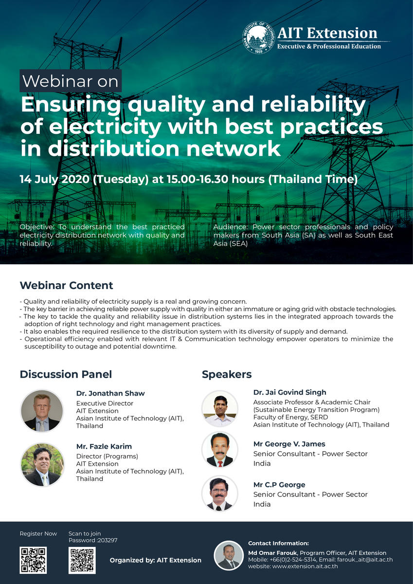 AIT Extension is pleased to invite you to a free webinar on "Ensuring Quality and Reliability of Electricity with Best Practices in Distribution Network" on 14 July 2020 at 15:00 - 16:30 hrs. (Bangkok time).